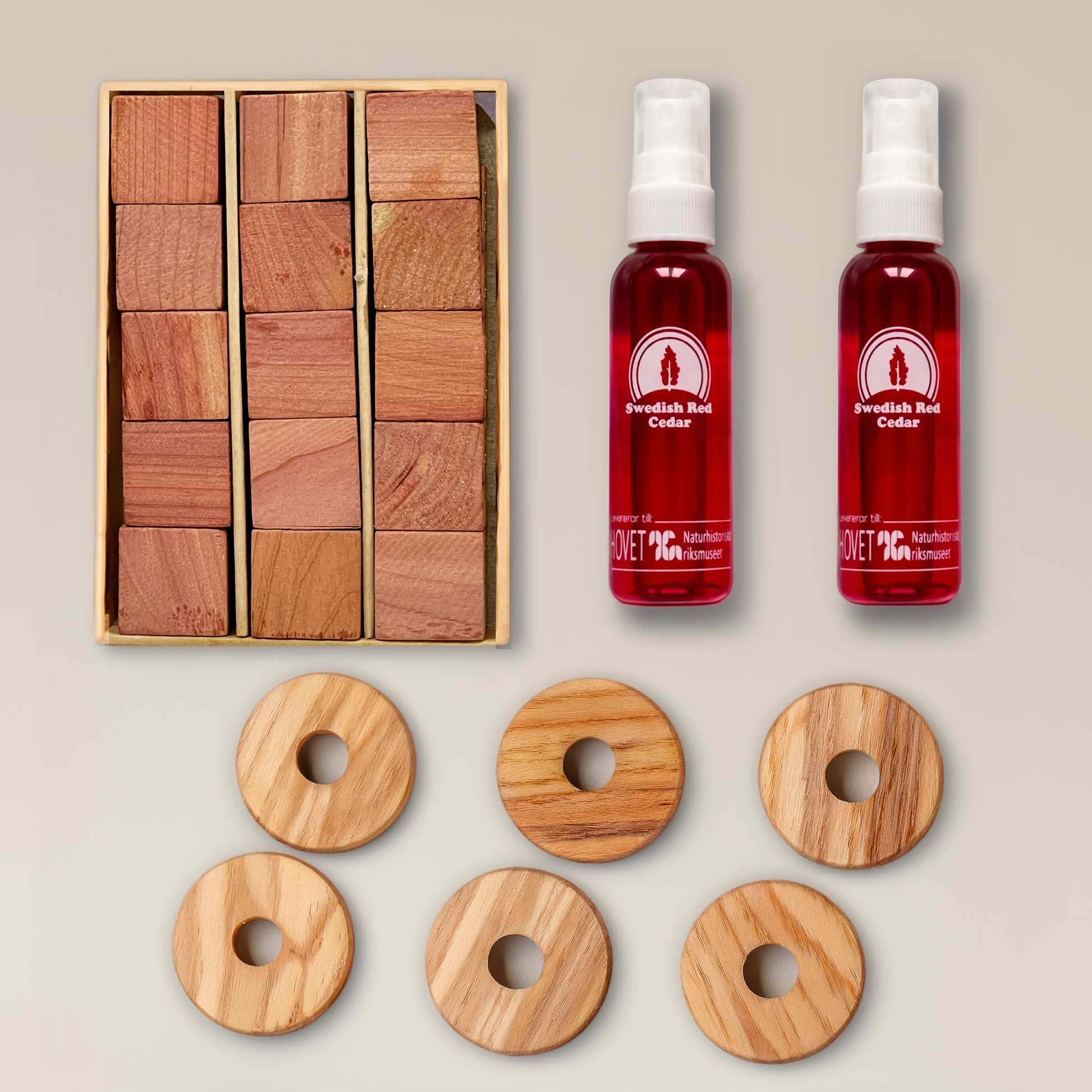Doften av rödcederträ anses vara långvarig och träet påstås vara ett röt- och svamphindrande ämne som håller upp till 50 år. Med andra ord blir dessa produkter i rödcederträ en hållbar investering som du kan ha nytta av länge, länge! Extra lyxigt med det här paketet är de vackra bitarna av cederträ formade som hjärtan och gjorda för hand.