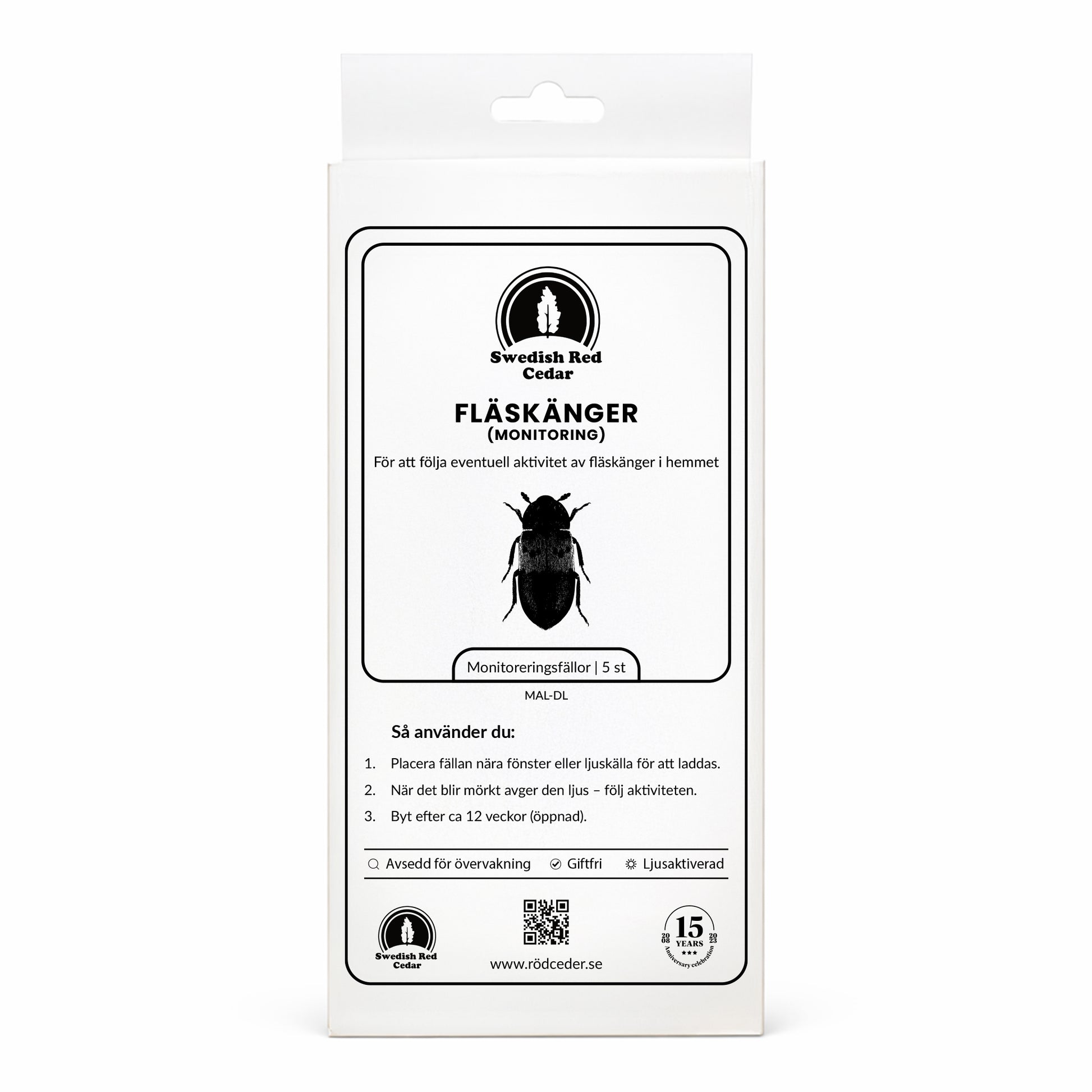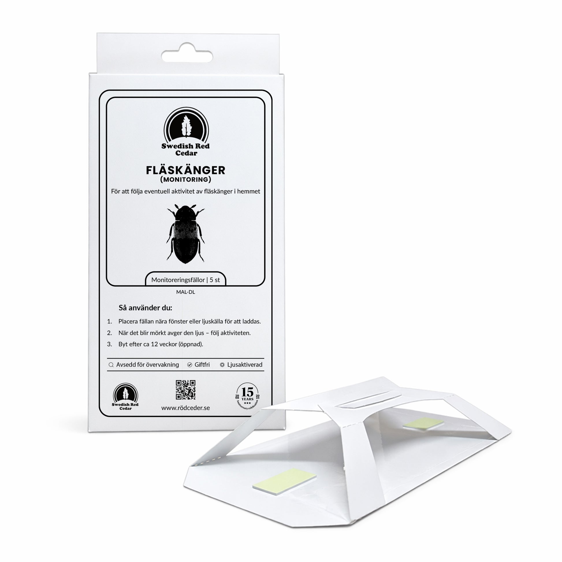 Giftfria monitoreringsfällor för att följa eventuell aktivitet av fläskänger i hemmet. Paketet innehåller 5 fällor. Fällorna är luktfria och fungerar med fotoluminescens: de laddas av ljus och avger sedan ljus i mörker, vilket kan göra dem användbara i utrymmen där du vill följa aktivitet.