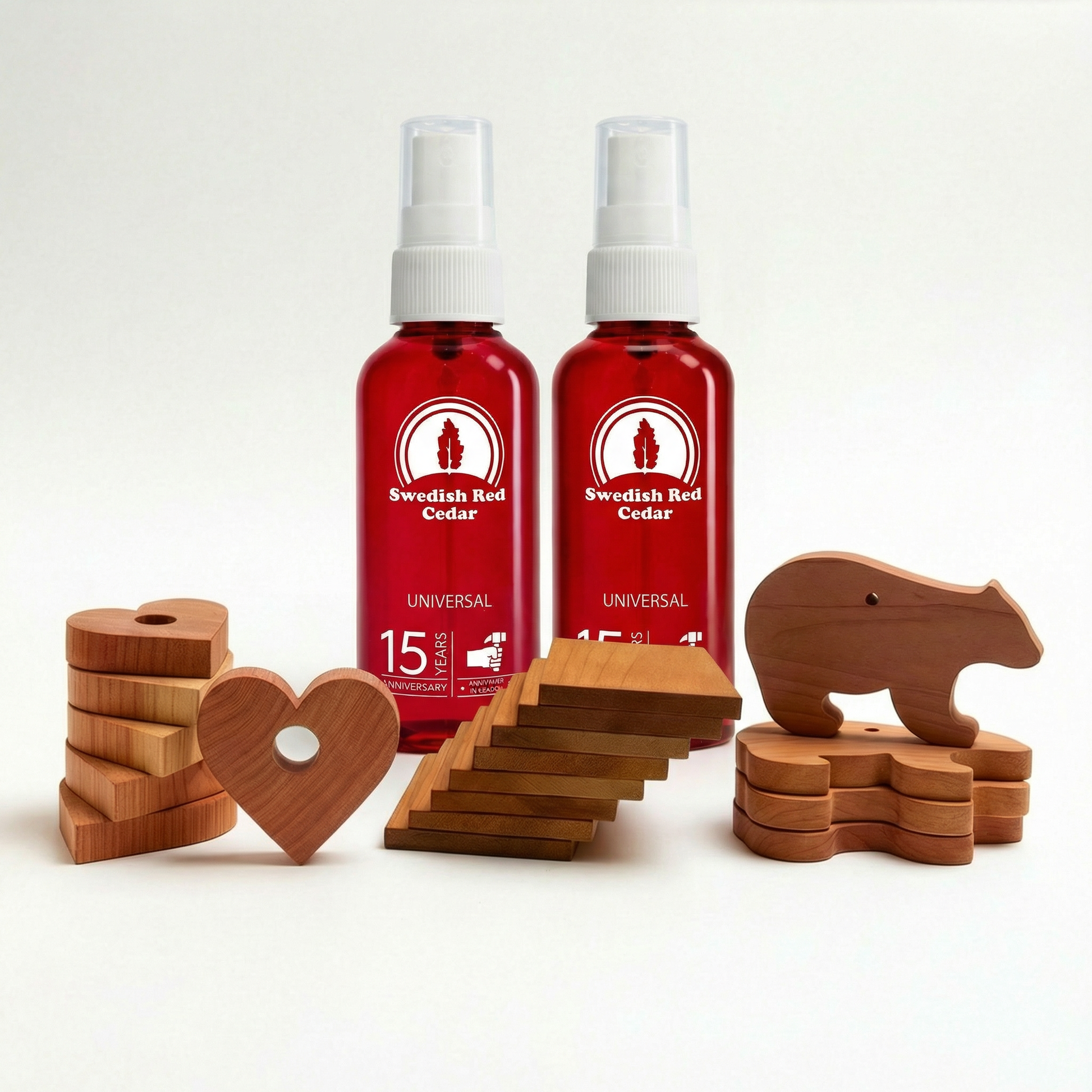 Rödceder Familjekit är vårt största paket med rödceder för hela hemmet. Här får du extra mycket rödcederolja i större 85 ml-flaskor och tre olika typer av rödcederträ – hjärtan, tunna block och björnar – så att du kan sprida ut rödceder i både garderober, lådor och på hyllor.